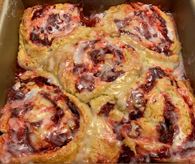 Below: Ruth's 9" x1 3" pan of r Roasted Rhubarb Biscuit-style Cinnamon Rolls