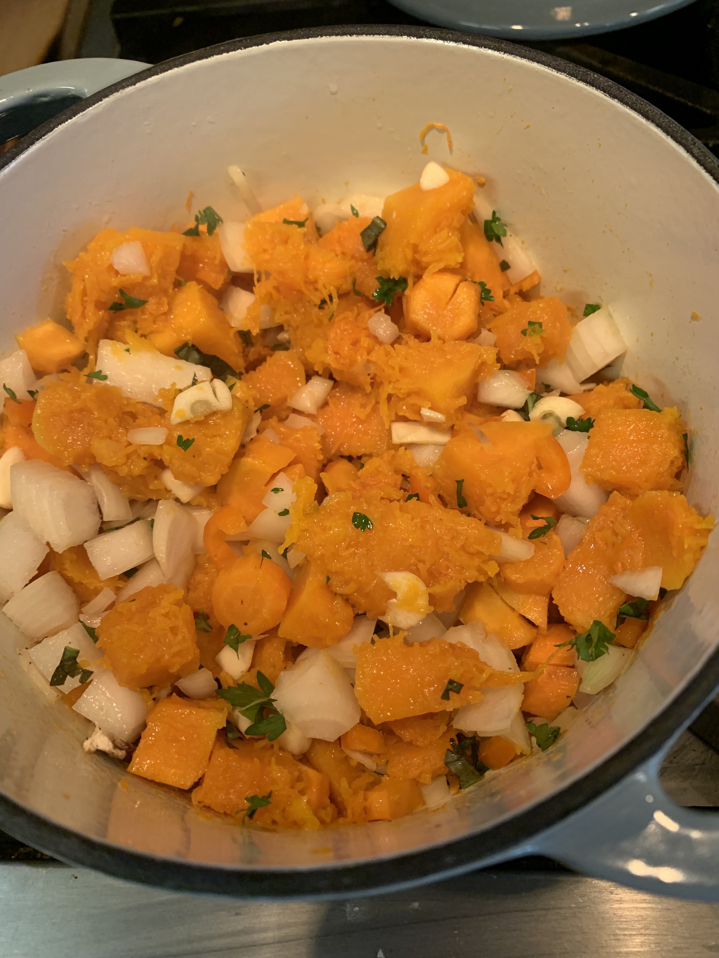- In a 2-quart Dutch oven, heat coconut oil over medium-low heat. Add carrots, butternut squash and thyme leaves; sauté for 10 minutes.